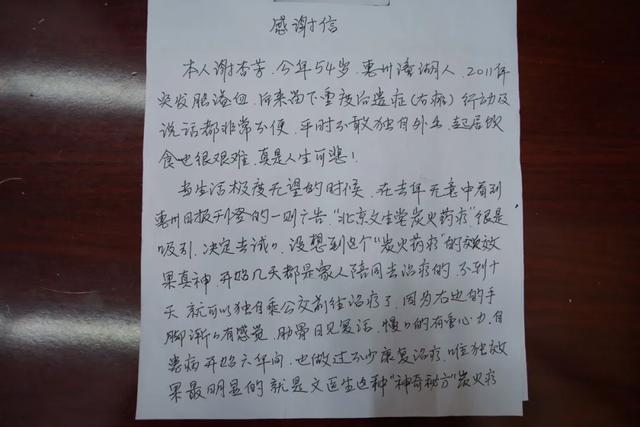 9、谢杏芳(54岁),从偏瘫到能独自坐公交车外出。仲恺区潼湖镇54岁的谢杏芳2011年突发脑溢血,后来留下重度后遗症(右瘫),行动及说话都困难,要两个人扶着才能走,四处求医无果。在生活无望的时候,了解到北京文生堂的炭火药疗技术,谢杏芳决定试试,从此改变了人生。理疗不到十天,谢杏芳竟然能独自坐公交车外出了,右手右脚感觉日渐恢复,肋骨日见复活。“我发自内心呼唤有疑难杂症的病友们尽快来治疗,早日脱离痛苦。”谢杏芳说。
