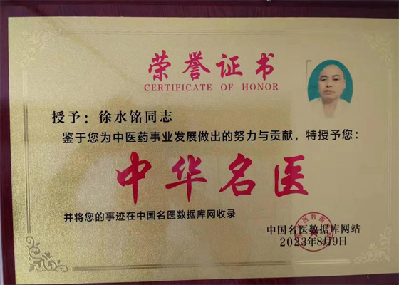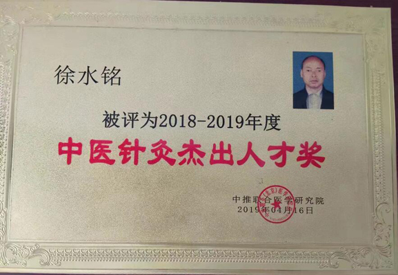 凭借在中医领域的卓越贡献和精湛医术,徐水铭医生获得了多项荣誉称号。他曾被中医扶持项目办公室、中国特效绝技绝活专家组委会、健济针灸医学研究协会授予“民间特效医术优秀人才”荣誉称号,这是对他在民间医术传承和创新方面的高度认可。2019年4月,他又被中推联合医学研究院评为2018 - 2019年度中医针灸杰出人才奖,这一荣誉进一步彰显了他在中医针灸领域的杰出成就和影响力。此外,他的个人业绩还载入了《“疫”情下的中医魂》典籍,成为中医界在疫情期间坚守和奉献的典范之一。
