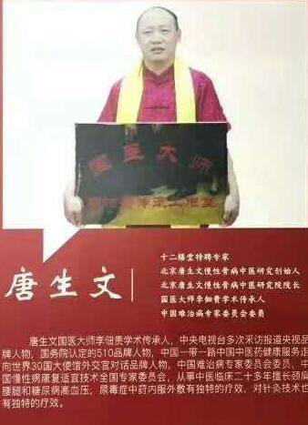 唐生文,湖南永州人,慢病首席专家,北京唐生文慢性骨病中医研究院创始人,国医大师李個贵学术传承人,国家AAA级诚信企业,中国一带一路中国中医药健康服务走向世界对话30国国家大使馆外交官品牌,全国难治病专家委员,国际大健康产业联盟理事单位,中国适宜技术专家委员。国家中医药产业技术创新战略联盟慢病首席专家,唐生文奇方,怪方药方,让你成为一方名医。为救助你的家人更多的苦难众生,让更多的人解脱病疼折磨,神奇秘方,不打针,不吃药,不手术,贴穴,点穴治疗法,简单方便无痛苦,无风险,见效快。给中医爱好者成为一方名医的机会,很多绝世秘方,奇方,怪方首次传世!让更多的患者解脱痛苦。