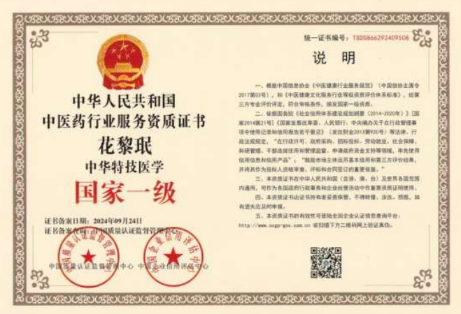 花黎珉医生的两部重要作品《特医理疗—未来医学》与《中华特色医学》均被国家版权局登记,彰显了其在特医领域的卓越贡献。他身兼数职,包括中国医药教育协会会员、中国康复医学会会员、国家高级健康管理师、中医康复理疗师(师资)等,还是多家权威医学机构的名誉副主席、副会长及特聘讲师,荣誉等身,包括“全国名中医”、“中医药行业领军人物”、“医学博士”、“国际中医大师”等称号,并在2024年担任世界中医药传承创新发展大会共同主席及科技强国国际智库共同主席。